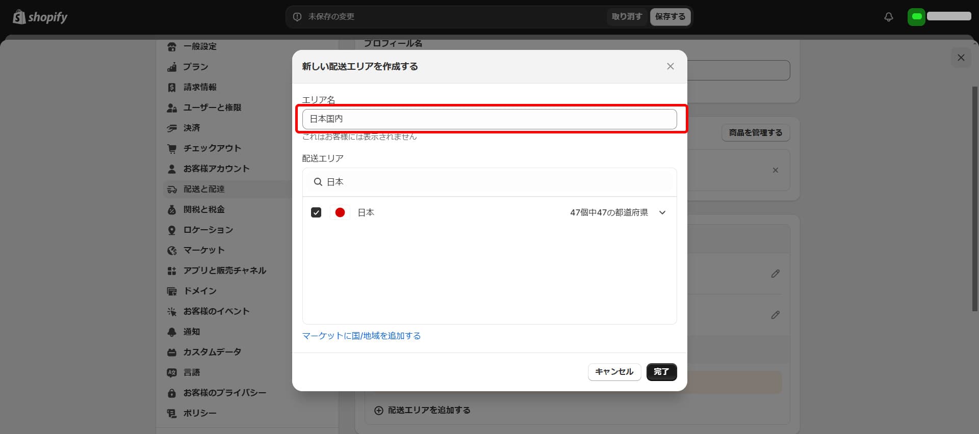3.エリア名と配送エリアを設定し完了をクリックします。