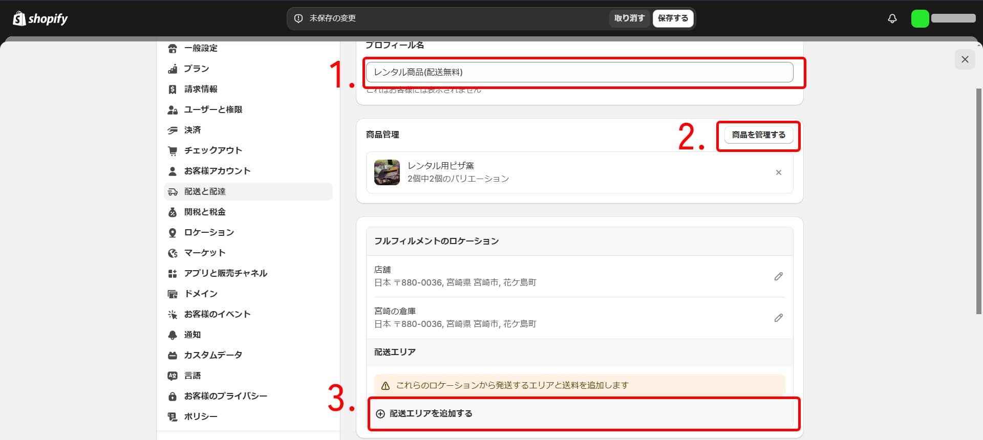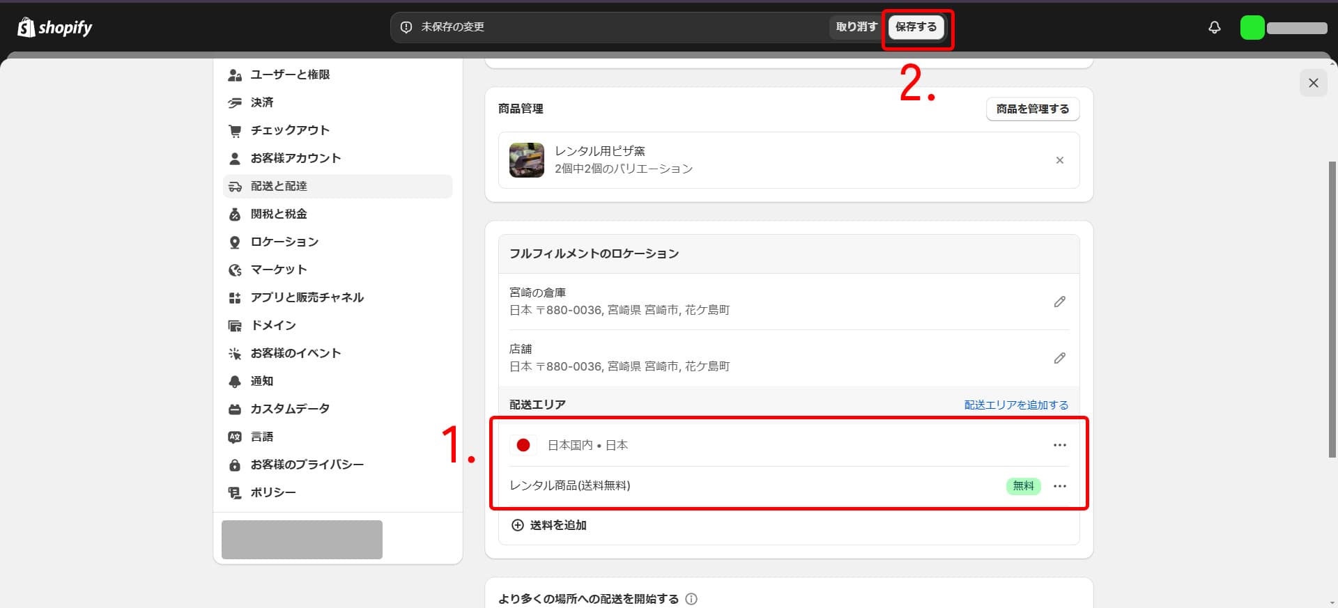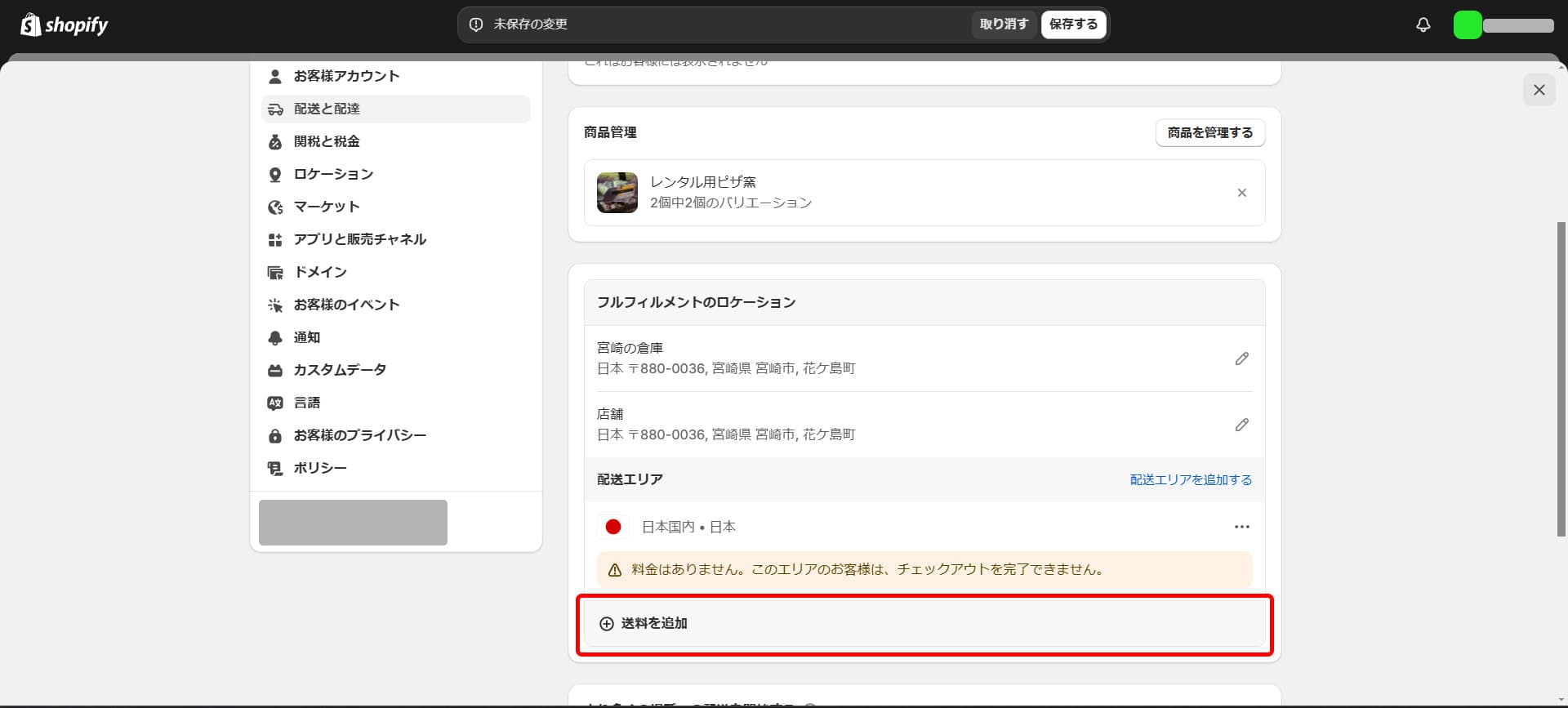 5.配送エリアと送料無料になっているかの確認をし、保存をしたら設定完了です。
