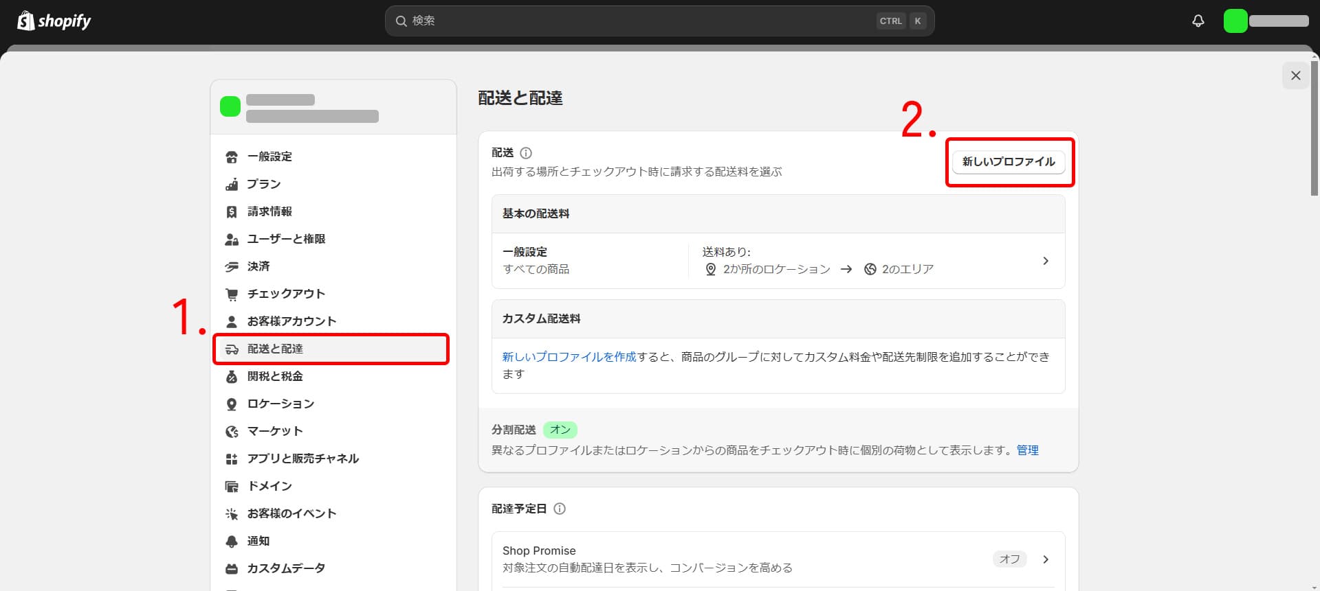 1.まずShopify管理画面の「配送と配達」>「新しいプロファイル」をクリックします。